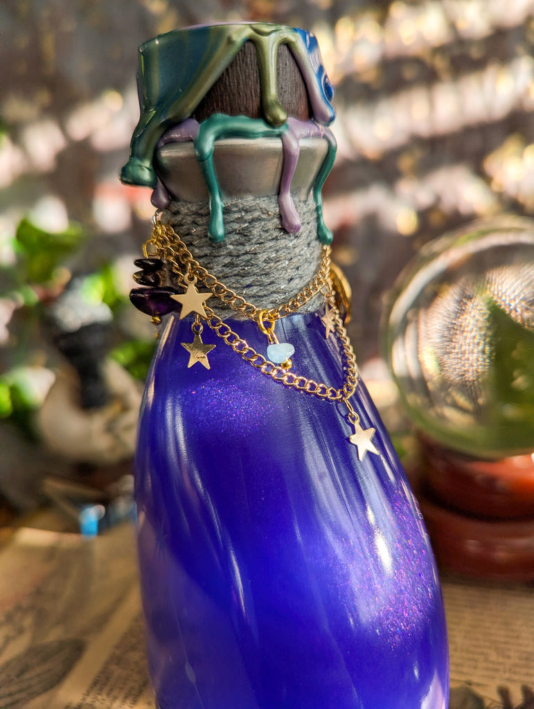 The blue elixir shimmers with sparks of silver and violet. The Aquarius constellation is etched on the back, while a golden zodiac medallion decorates the neck of the bottle. The star chains are threaded with aquamarine, amethyst and red garnet chips.
