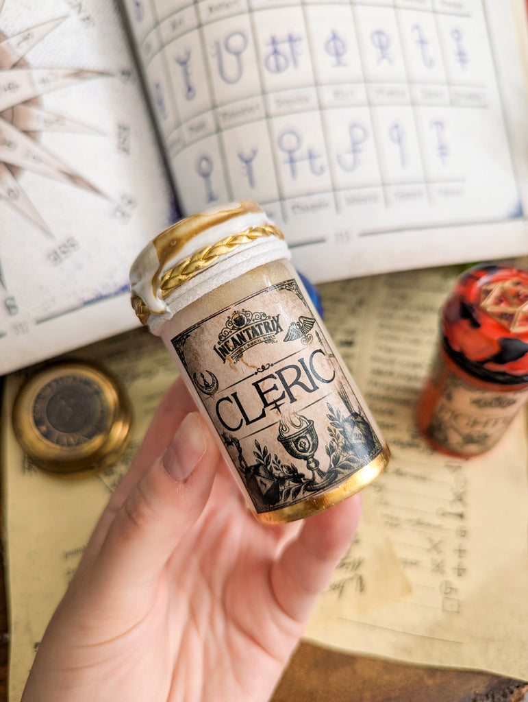 This Cleric D20 potion is a serene, clear liquid that bursts into a glowing swirl of white and gold when shaken. Invert the sealed bottle and watch as a radiant gold D20 gently rises through the light-filled liquid, revealing your roll like a vision from the divine.