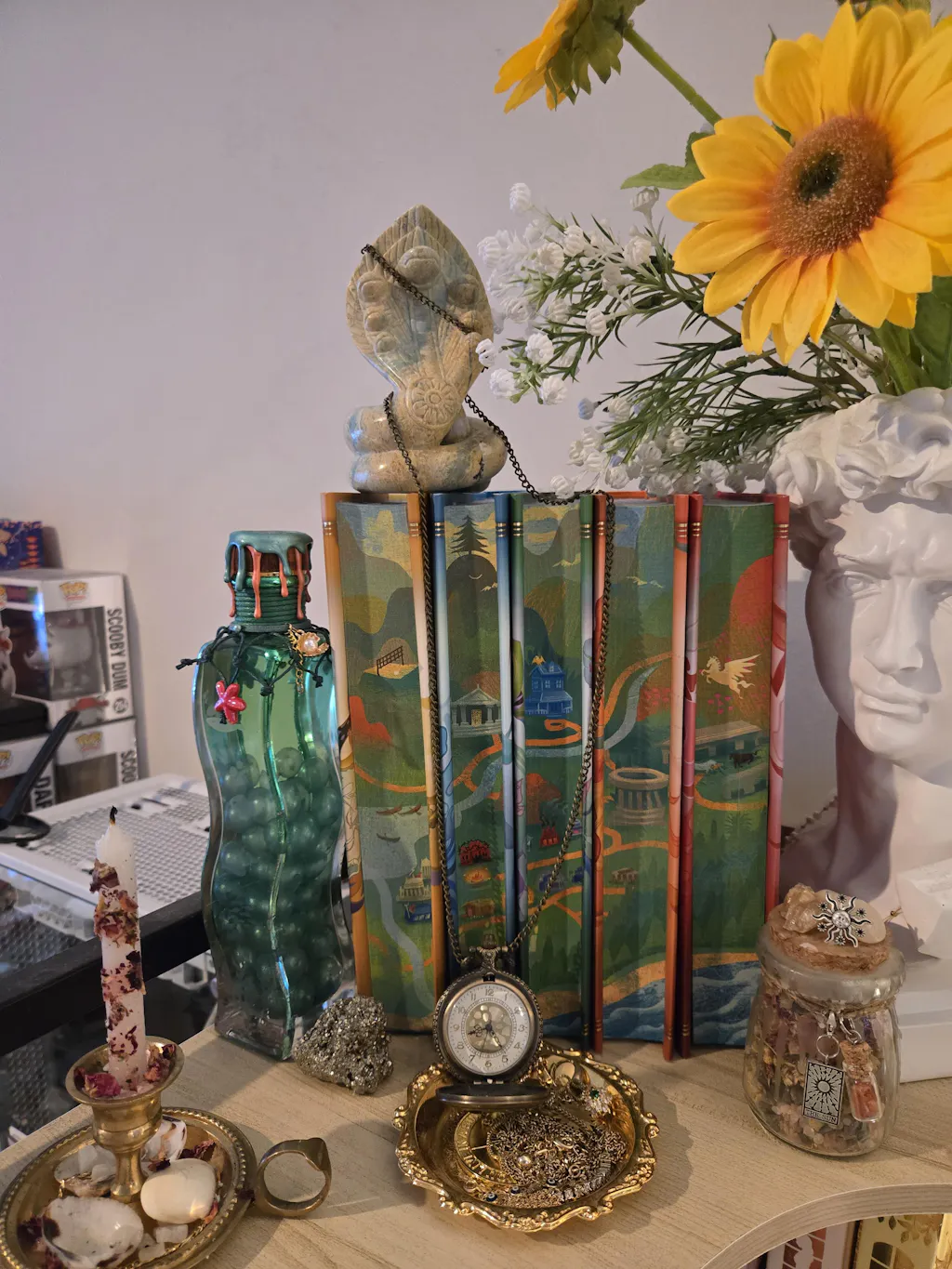 Moved by the melody, the mermaids pulled the bard to the safety of the shore - weeping to his haunting beautiful voice while they swam. The bard was found upon the beach by a young witch, who nursed him back to health in her Apothecary and they become fast friends.